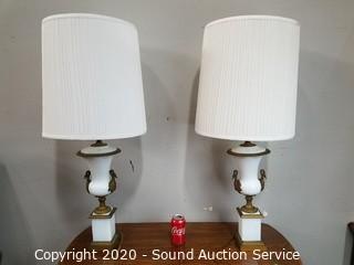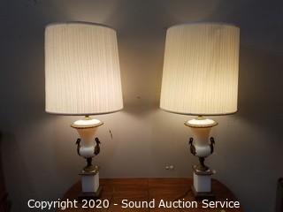 Lot Details: Shades included. One of the lamps has a pull switch stuck in the ON position and a loose light socket making one of the light bulbs not stay on properly, one of the bases is loose. The other lamp works great. 34" tall.