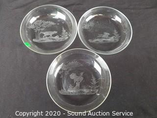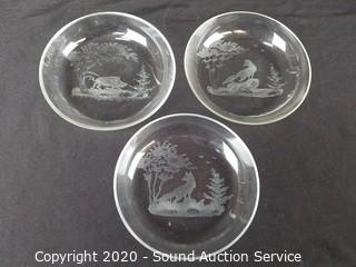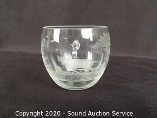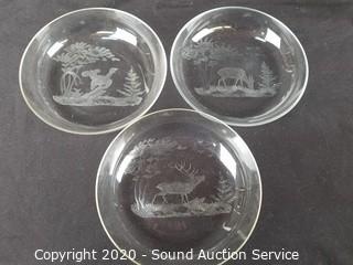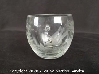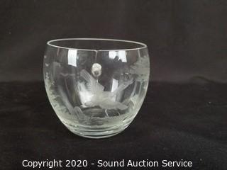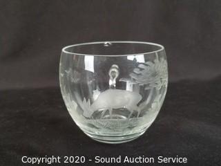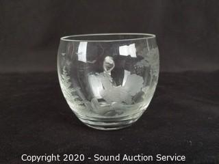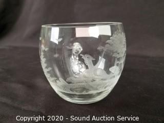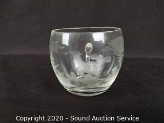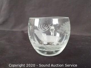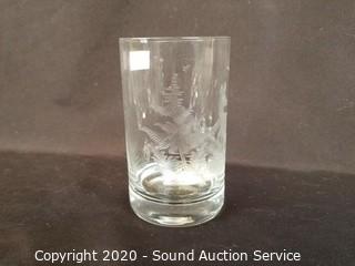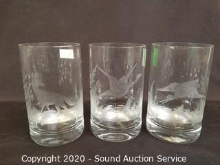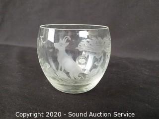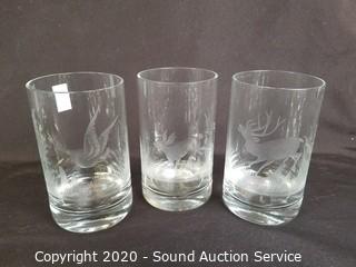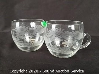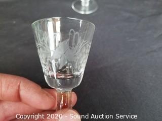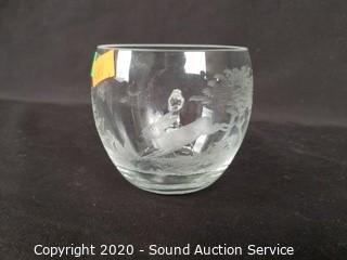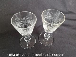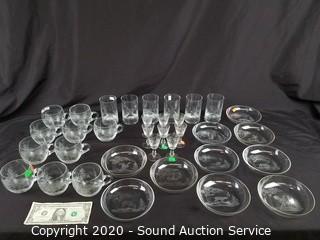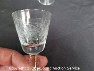 Lot Details: Cups, nappies, cordials and tumblers. All but the cordials have etched hunting scenes, all appear to be hand made. Cordials are etched with a grape pattern.
