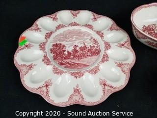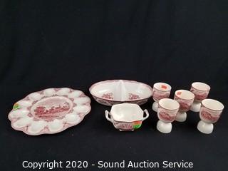 Lot Details: Green stamp, excellent condition. Includes Deviled egg plate, divided dish, sugar dish and 5 egg coddlers.