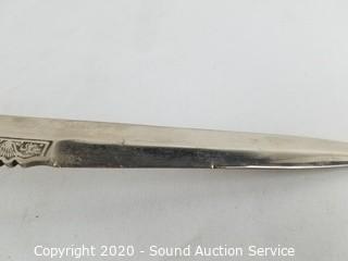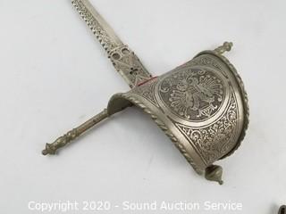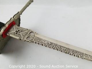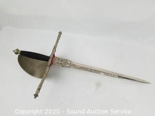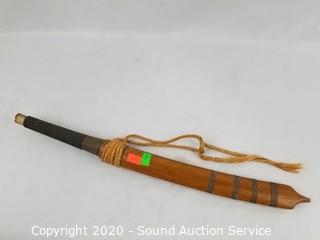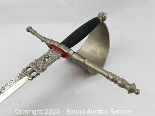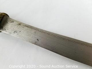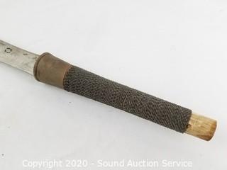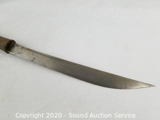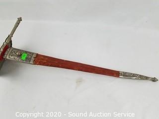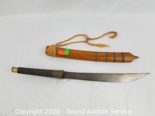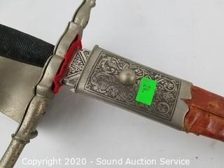 Lot Details: The decorative dagger has a large cross and hand guard, 16" blade 22" overall, leather and metal sheathe does not quite go on all the way and top part has detached from the leather. The primitive dagger has a 10" blade, 16" overall, with a bamboo sheathe.