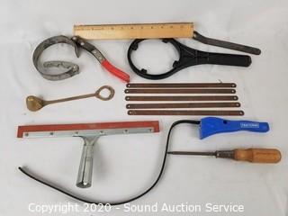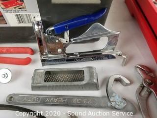Lot Details: 24" x 11" x 10.7". Bungee's, Wrenches, Screwdrivers, Flat-bar, Level, Mallet, Caulk Gun & More.