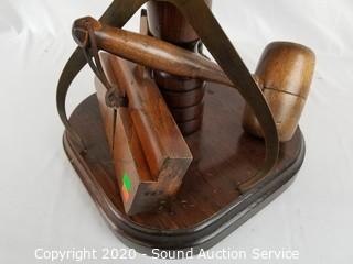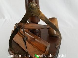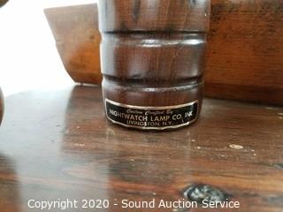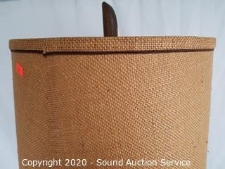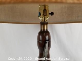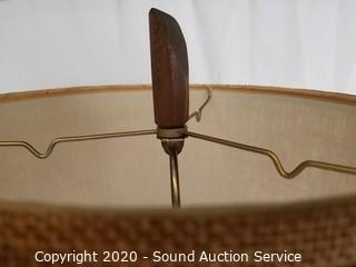 Lot Details: Wooden base with vintage tools decorating the exterior, burlap fabric shade. Works! Overall 32" T x 15" W base, 12" diameter shade.