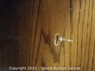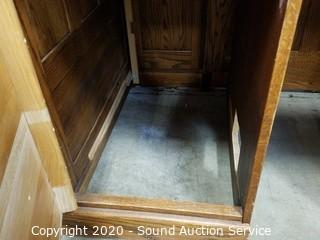 Lot Details: Modern construction to hold a desktop computer. Lower locking computer tower compartment, glass top to mount a monitor, could be extended for larger wide screen monitors. Compartments Everywhere. 51" H x 61" W x 33" D. Locking top with keys. Whole in the bottom left inside, and missing the bottom in the left cabinet.
