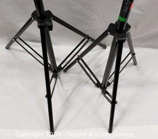 Lot Details: Both work using a 12V adapter (not included). Light can last for 2.2 hours with an NP750 battery (not included). Comes with tripod stands.