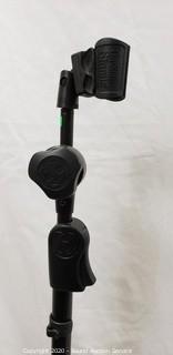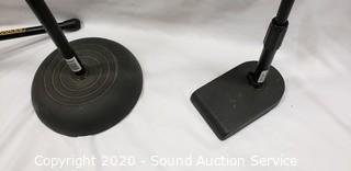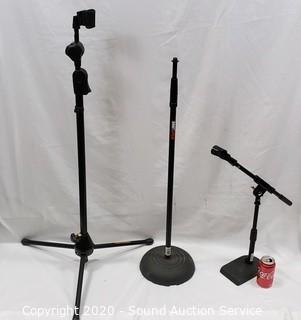 Lot Details: Cast iron bases. Includes an MS235BK round base mic stand, adjust 36" to 60", MS112BK desktop boom mic stand and Hercules mic stand, adjusts 40" to 94".