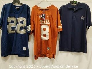 Lot Details: Includes Dallas Cowboys S:M polo, Nike Texas jersey S:L and Emmet Smith jersey S:XL. All in excellent condition, some may have original tags.