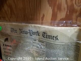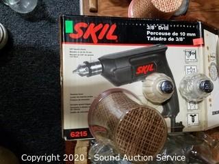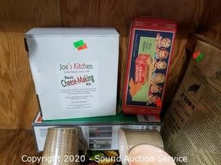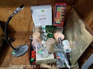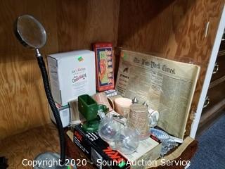 Lot Details: Vintage newspaper, articulating magnifying glass, cruet sets, mugs, drill, cheese baking kit, rug and more.