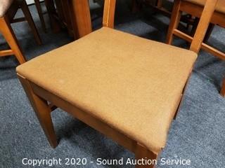 Lot Details: Comes with 8 chairs (2 different styles of upholstery, one has a tear on the corner, one chair is a captains chair) & 2 leaves. Some wear to the finish. 30" H x 40" x 58" with (2) 12" leaves.