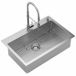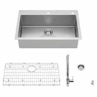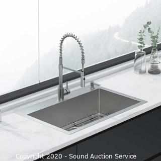 Lot Details: Brand new, $359 Retail value. Includes: Single Bowl Sink, Drain, Bottom Grid, Semi-Professional Kitchen Faucet, and Soap Dispenser. Premium Handcrafted 18 Gauge 33"x22" Stainless Steel Dual Mount Sink. Semi-Professional Stainless Steel Faucet with flexible hose and dual function spray-head. Sink Dimensions: 33" L x 22" W x 9" D.