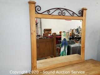 Lot Details: Matches the previous and next lots. Metal accents and drawer pulls, dovetail joinery. A few minor chips around the drawers and one chunk missing on the side of the dresser, gives. Overall good condition. 6.75" x 65" x 20" dresser. 42" x 44.5" mirror topper.