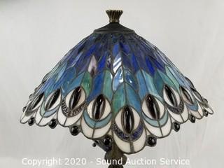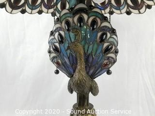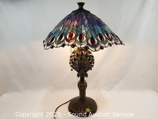 Lot Details: Dual light, works. Base is in the shape of a Peacock with stained glass feather shade. 25" H x 18" Dia.