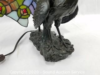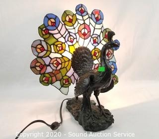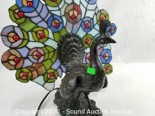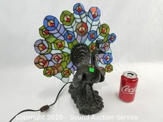 Lot Details: Works. Base is in the shape of a Peacock with stained glass feather shade. 15" H x 14" W.