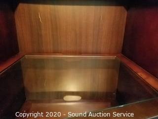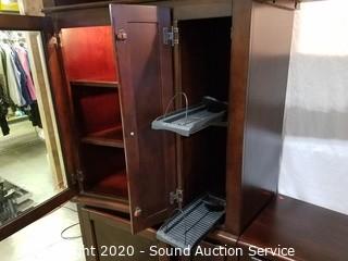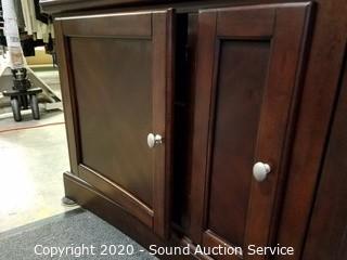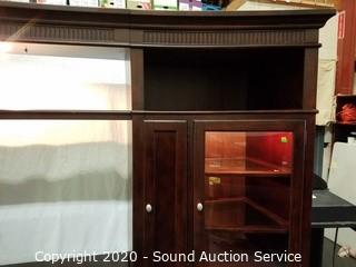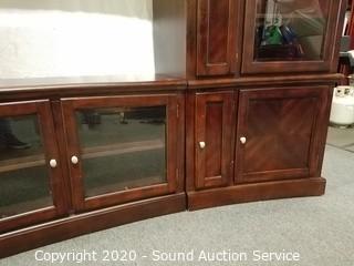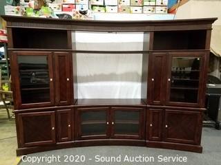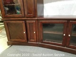 Lot Details: In great condition. Beveled glass, pull out disk drawers. Fits a 45" wide TV. Bottom left cabinet is missing the hardware that keeps door closed (little roller). Minor damage inside left top cabinet on the back side. 80" H x 111" W x 25" D.