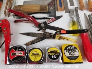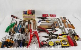 Lot Details: Includes T-handle hex key set, torpedo level, folding rule, pipe cutter, trimmers, pliers, tape measures, squares and more.