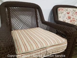 Lot Details: Some sun fading & wear to the cushions. One does not come with back cushion. 35" H x 29" W x 18" to seat.
