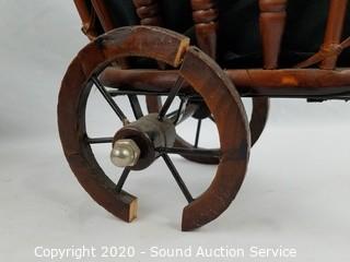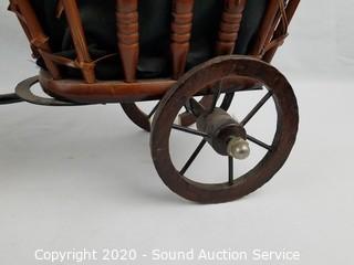 Lot Details: Includes bent wood plant stand and metal and wood basket (has a broken wheel). Approx. 10" x 16" and 12" x 16".