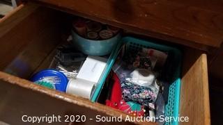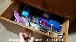 Lot Details: Cabinet is loaded with sewing supplies. Comes with owner's manual and foot pedal. Works! Cabinet is 29" x 40" x 17".