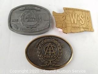 Lot Details: Includes International Association of Chiefs of Police buckle, 60th Anniversary Washington State Patrol buckle, 1959 Montana Law Enforcement Academy buckle, Calgary 1983 Police Service buckle, 100 Year Anniversary Washington Police Chief's Association buckle, 50th Anniversary Oregon State Police buckle, Alexandria Law Enforcement Training buckle and Michigan State Police buckle.