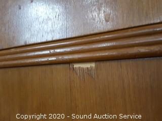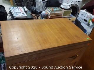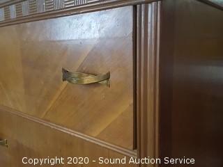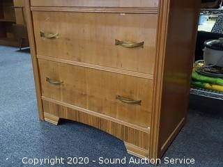 Lot Details: Top drawer is not quite closing all the way, some ware to the finish, fair condition. All wood, dovetail joinery. 47" H x 30" W x 17.5" D.