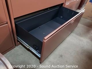 Lot Details: Holds up to legal size, ball bearing drawer guides, drawers are labeled. In good condition. 42.5" x 42" x 18". Some minor wear. Locking, no key.