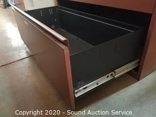 Lot Details: Holds up to legal size, ball bearing drawer guides, drawers are labeled. In good condition. 42.5" x 42" x 18". Some minor wear. Locking, no key.
