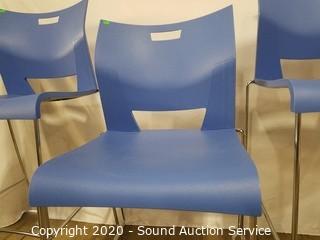 Lot Details: One Chair is lower, 20" to seat. 45" T x 18" W, 30" to seat. In excellent condition. Chrome finish legs with blue heavy duty plastic contoured seats.