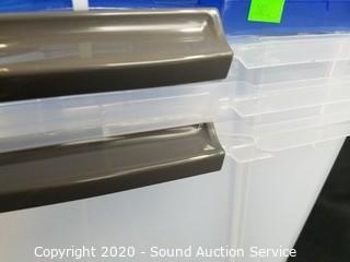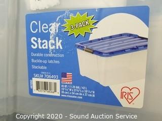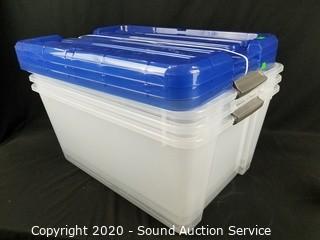 Lot #0102: 3 Clear 45qt Plastic Stackable Totes w/Lids