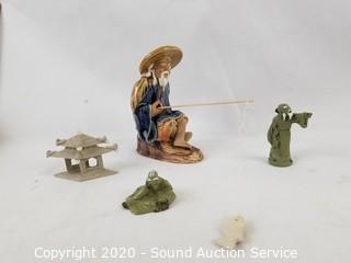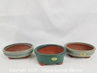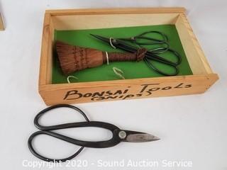 Lot Details: Includes 3 pottery bonsai pots, 3 hand forged trimming scissors with brush and potting stone.