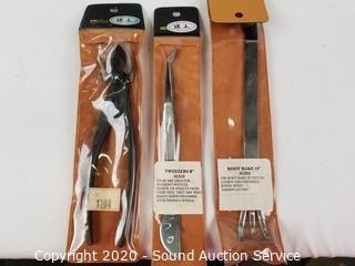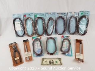 Lot Details: Includes 9 packages of anodized aluminum wire (1.5mm to 3.5mm), Dohghin 8" tweezers, 8" concave cutter and 10" root rake.