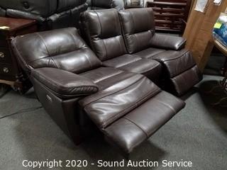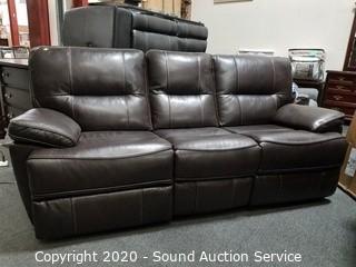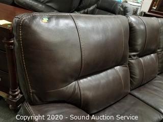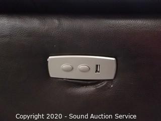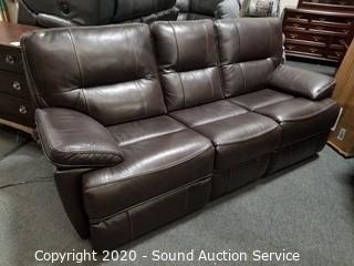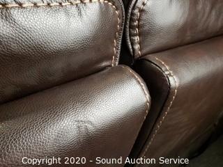 Lot Details: In overall good condition, back left side has some damage (scuffs and a couple small tears on the edge) and the leather near the buttons has a crease. Works. 39" x 84" x 34", 20" to seat.