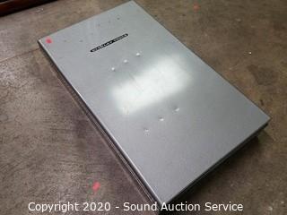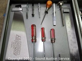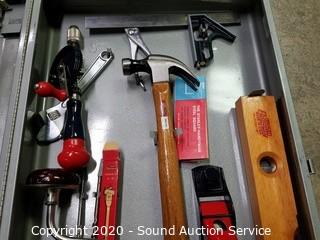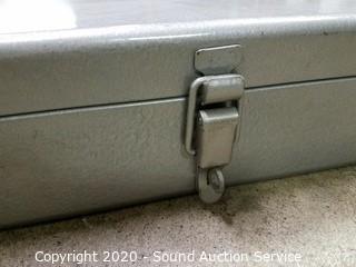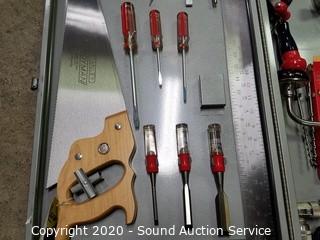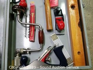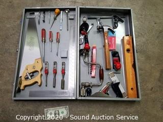 Lot Details: Includes cross cut saw, chisel, punches, awl, carpenter's squares, planes, level, augur bits and braces, hammer, adjustable wrench and pliers, folding rule and steel case. Case is 4.5" x 26.5" x 16". Has an eyelet for a padlock.