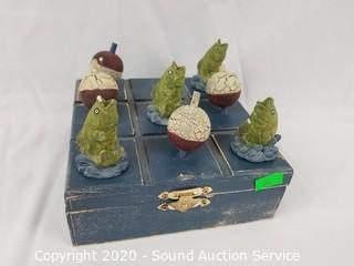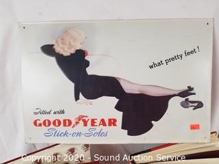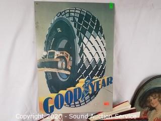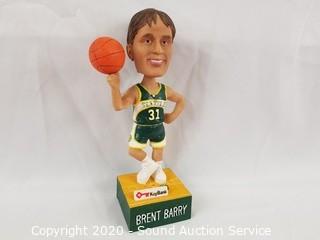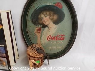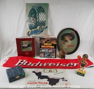 Lot Details: Includes Brent Barry bobblehead, vintage fishing figurines and basket, 20" x 30" Budweiser flag, North American Hunting Club and Great Disasters books, vintage Coca Cola tray and Good Year signs.