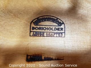 Lot Details: Top lifts to reveal jewelry compartment & tray. Dovetail joinery. Excellent condition. 53" H x 21" W x 12" D. Has a makers mark burnt into the back, unable to make out.