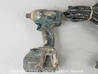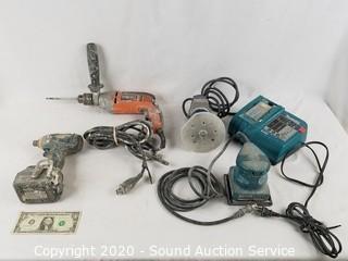 Lot Details: Ridgid 1/2" Drill, Makita 18v 1/4" Drill w/Charger & Battery, Ryobi Hany Trimmer, Makita Finishing Sander BO4510.