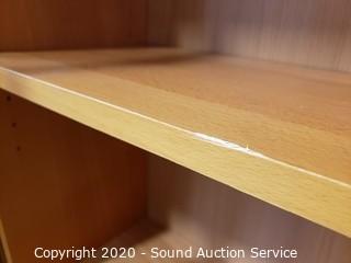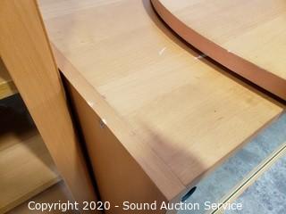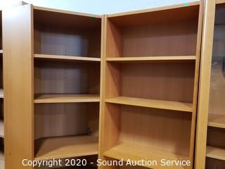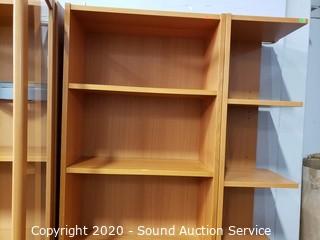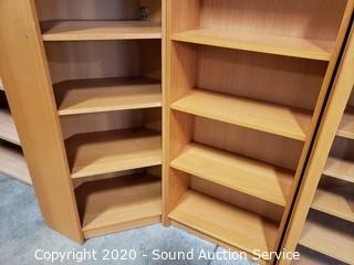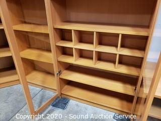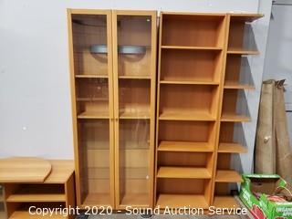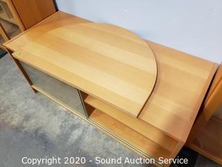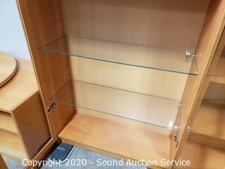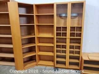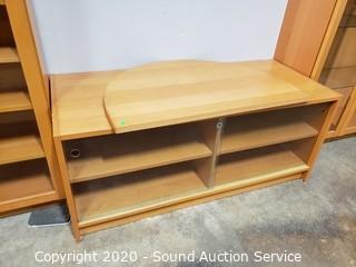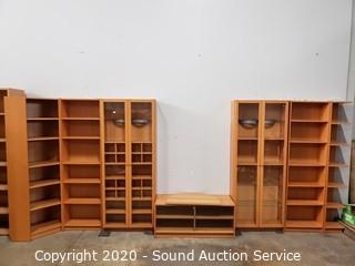 Lot Details: Adjustable shelves, 2 of the units are lighted, one corner unit. Center TV console with swivel top. In good condition. Two holes have been cut into the back of one of the side shelf units. 80" H x 16'ft long overall.