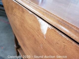 Lot Details: One leaf has some damage to the top, mechanism that locks it in place has come free from the center (refer to photos), otherwise in good condition. 28" H x 33" x 18" with 2 10" drop leaves, single drawer. Table is 22" H x 18" x 11".