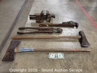 Husky 60 Gallon 220v Upright Air Compressor, Heavy Duty Rolling Steel Workbench w/Vise, Grizzly Oscillating Spindle Sander G9922, Master Industrial 24" Disc Sander, Heavy Duty Steel Utility Cabinet, Commercial Scaffolding, Wilmar Engine Stand, Grizzly G8693 Mini Shaper, Natural Pine Furniture, Stanley Heathered Oak Furniture, Vtg. German Hilborn Hamburger USN Dress Sword, Lighting, Bathroom Essentials, Cookware, Tools, Hardware, Furniture & Much More!!!