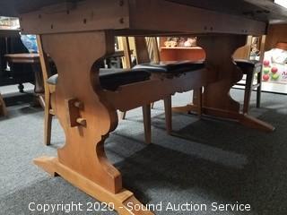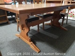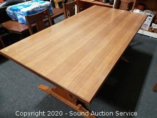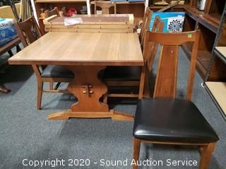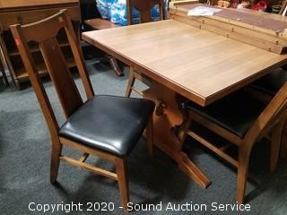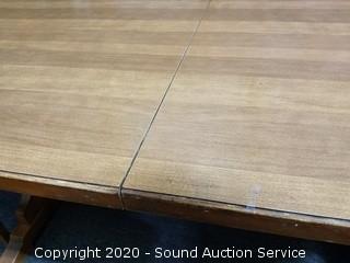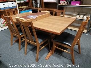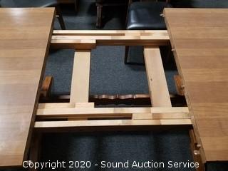 Dining table with 6 chairs & (3) 12" leaves. Some wear to the finish on the chairs, overall good condition. 30" H x 71" x 36".