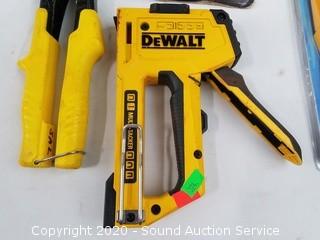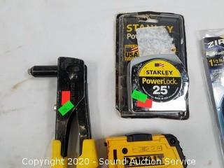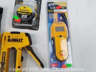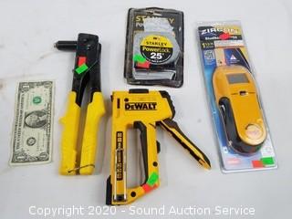 Includes DeWalt multi-tacker, Stanley Powerlock 25ft tape measure, Stanley riveter and Zircon HD55 stud sensor.