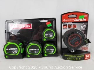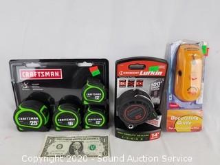 Includes Lufkin Shock Force 25ft tape, Craftsman 12ft, 16ft and 25ft tape measures and Zircon HD25 stud sensor.