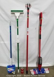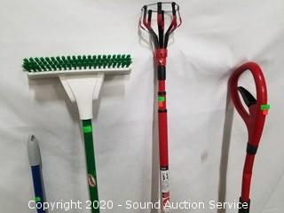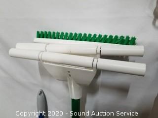 Spray mop has a dent in the handle, otherwise like new. Cobweb remover has been lightly used. Also comes with a mop handle and a light bulb changer.