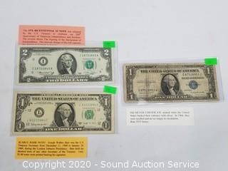 1963-B Scarce Barr Note, 1976 Bicentennial $2 Note, & 1935-G Blue Seal Old Silver Certificate. ATTN: We are not coin or currency experts or graders, please use your own judgement when bidding.