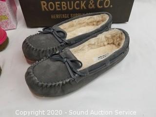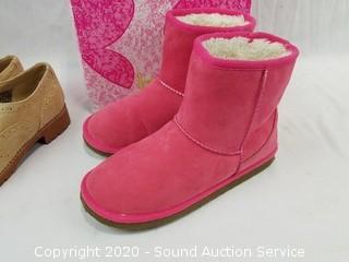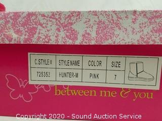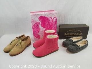 Between me & you Pink boots, Sperry Top-Sider leather shoes, Roebuck & Co slippers. All in good condition.