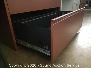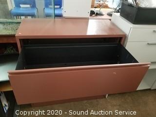 Lot Details: Holds up to legal size, ball bearing drawer guides, drawers are labeled. In good condition. 42.5" x 42" x 18". Some minor wear. Locking, no key.