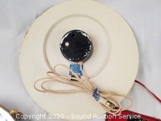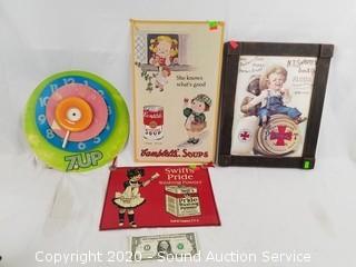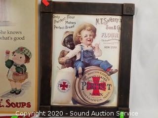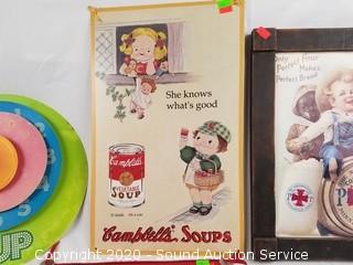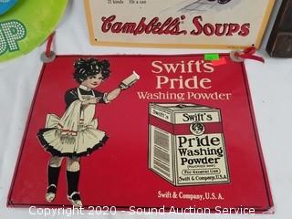 Lot Details: Clock is not working, possibly missing a piece. Includes Tin "Switz Pride Washing Powder", "Campbell's Soup" "N.P.Swezey's Sun & Co." signs. 9" x 12" to 10" x 16".