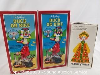 Lot Details: Includes Russian toy, Walkin' Robot, Rover the Space Dog, (2) Duck on Bike and Drumming Animal. All work, in excellent condition. Also comes with a 1938 "Secret Agent X-9" book.