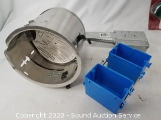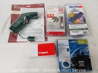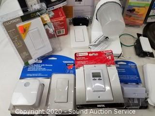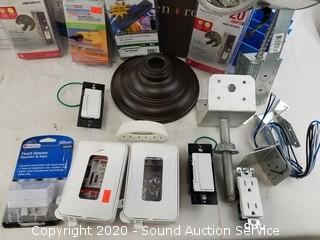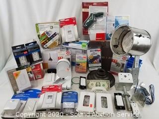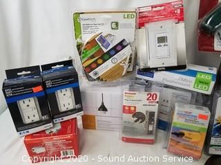 Lot Details:  Includes mini pendant, replacement power  head, pipe heating system, light tester,  J-boxes, in wall timer, GFCI receptacles,  outdoor outlet cover, slide dimmer switch, touch dimmer, LED tape light kit, mini flush  mount light and more.