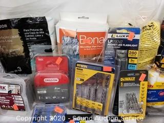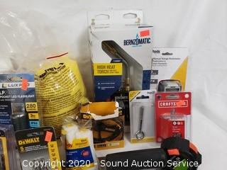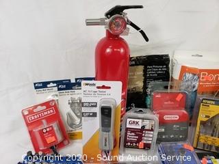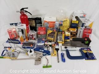 Lot Details: Includes C-clamp, bit sets, fire extinguisher, screws, sockets, quick links, pullies, razor knife, LED flash light, voltage tester, paint rollers, absorbent line cloth, hole saw bits, high heat torch and more.