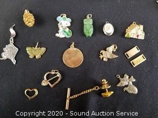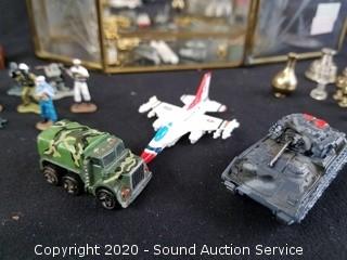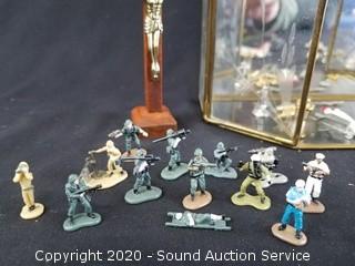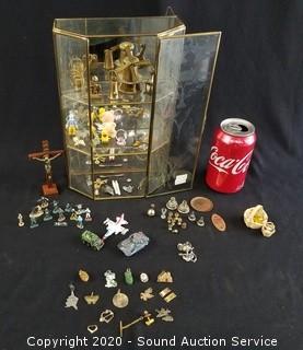 Lot Details: Includes miniature figurines, vehicles, pins, crucifix and more. Display is wall mount, 11" x 7" x 3".
