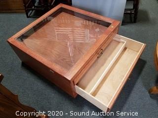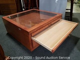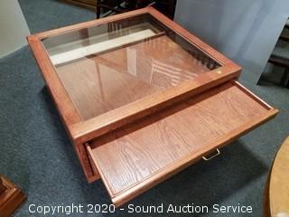 Lot Details: One drawer has 2 removable trays. Drawers are the size of the table. 16" H x 38" x 38". In excellent condition.